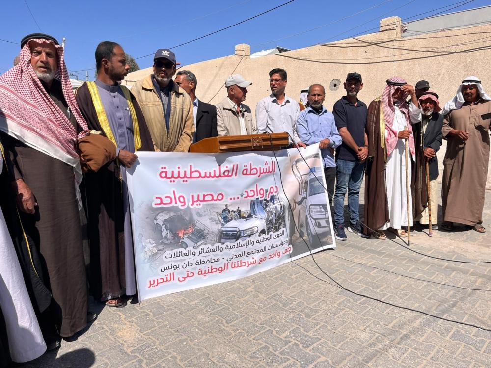 نظّمت القوى الوطنية والإسلامية في محافظة خانيونس، يوم السبت، وقفة احتجاجية في باحة مجمع ناصر الطبي، بعنوان "حماية الشرطة واجب ديني وأخلاقي".