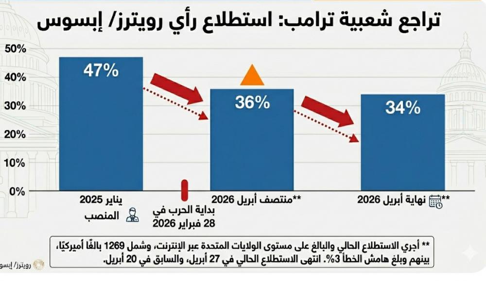 وبحسب استطلاع أجرته "رويترز/ إبسوس" على مدار أربعة أيام وانتهى، الإثنين، ونشرت نتائجه مساء أمس الثلاثاء، فإن 34% من الأميركيين يؤيدون أداء ترامب في البيت الأبيض، مقابل 36% في استطلاع سابق أُجري بين 15 و20 نيسان/ أبريل.