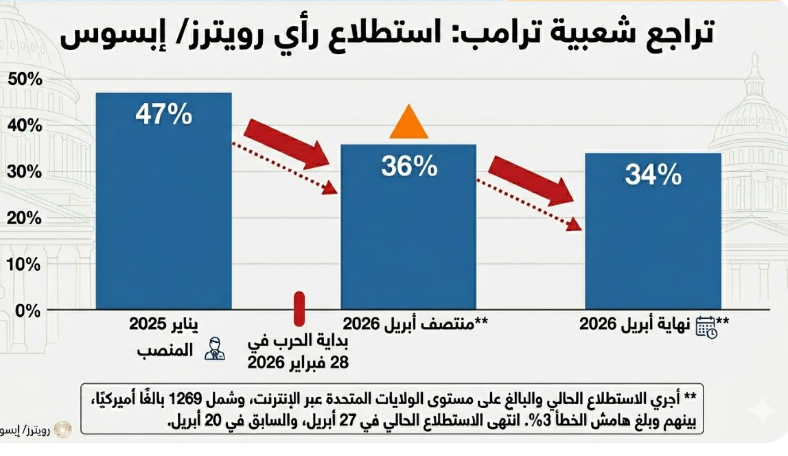 وتراجعت شعبية ترامب منذ توليه منصبه في كانون الثاني/ يناير 2025، حين منحه 47% من الأميركيين تقييمًا إيجابيًا، قبل أن تتراجع بشكل حاد منذ بدء الحرب الأميركية الإسرائيلية على إيران في 28 شباط/ فبراير.