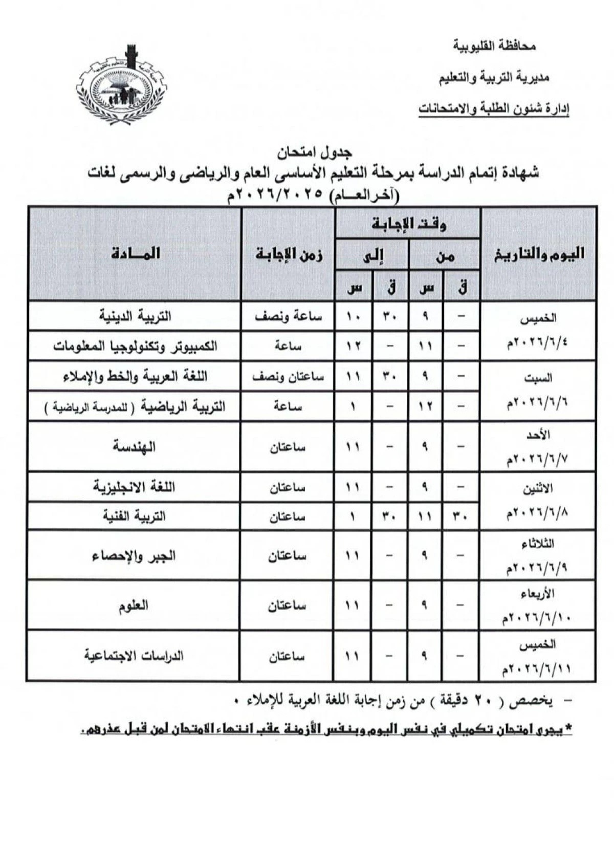 أعلنت مديرية التربية والتعليم بالقليوبية عن جدول امتحانات الشهادة الإعدادية الترم الثاني للعام الدراسي 2025-2026، بعد اعتماده رسمياً من محافظ القليوبية. تهدف المديرية لضمان سير الامتحانات بسلاسة وانتظام مع توفير بيئة مناسبة للطلاب.