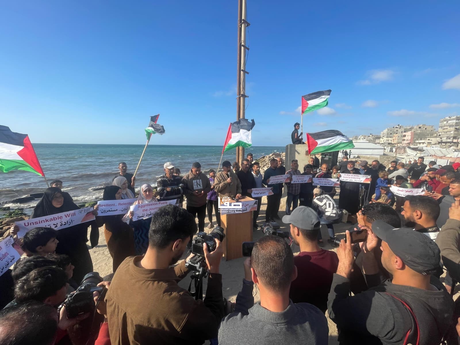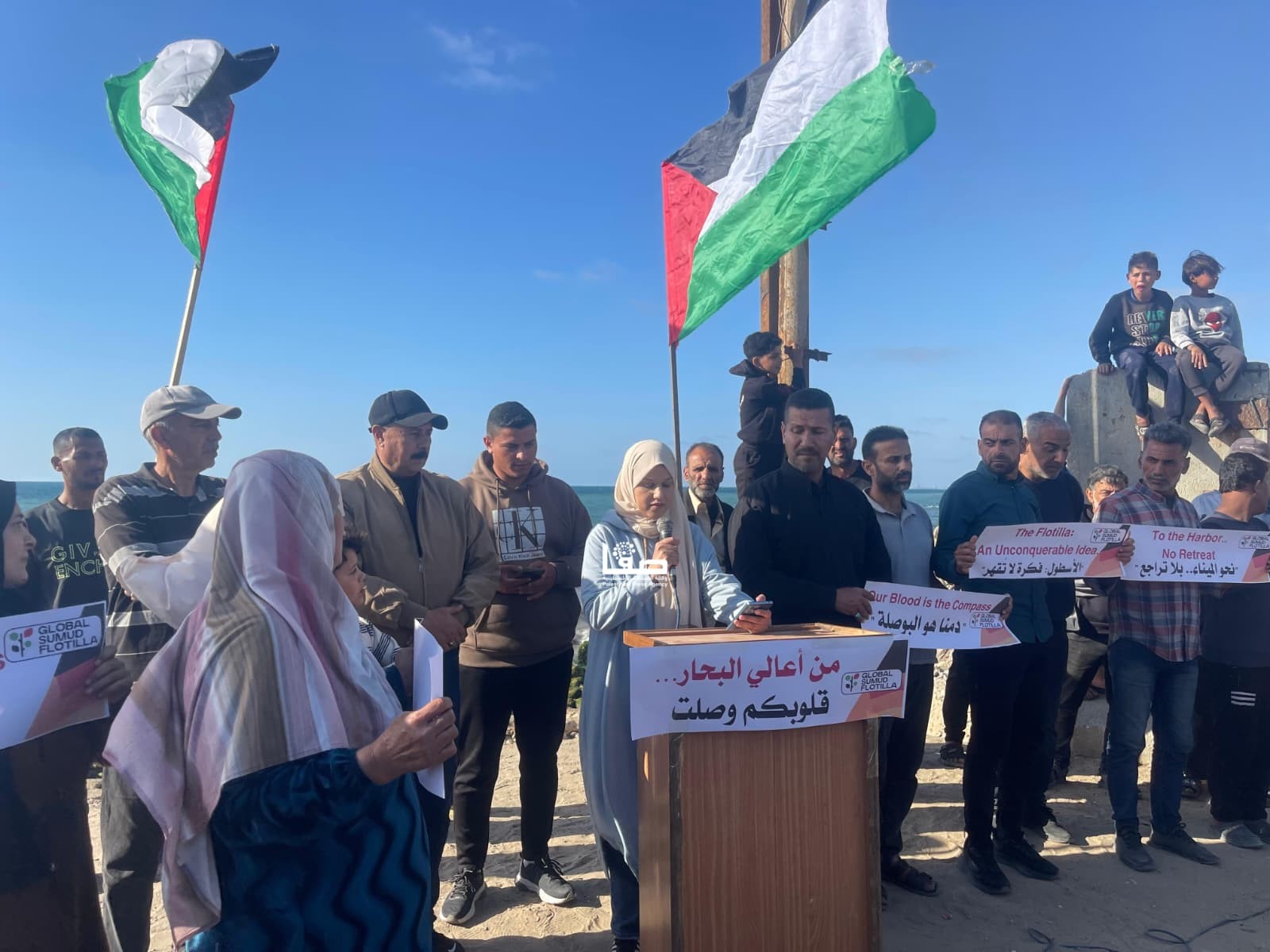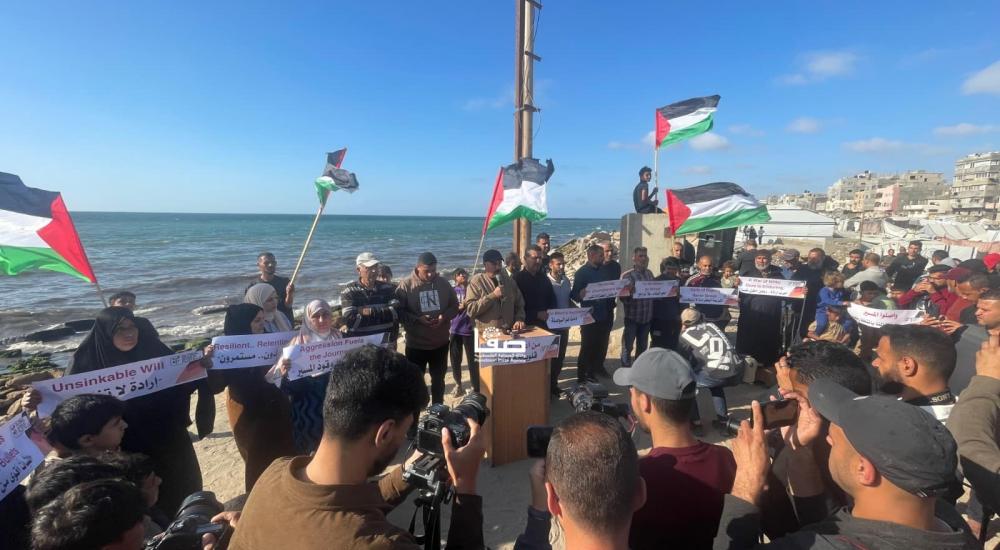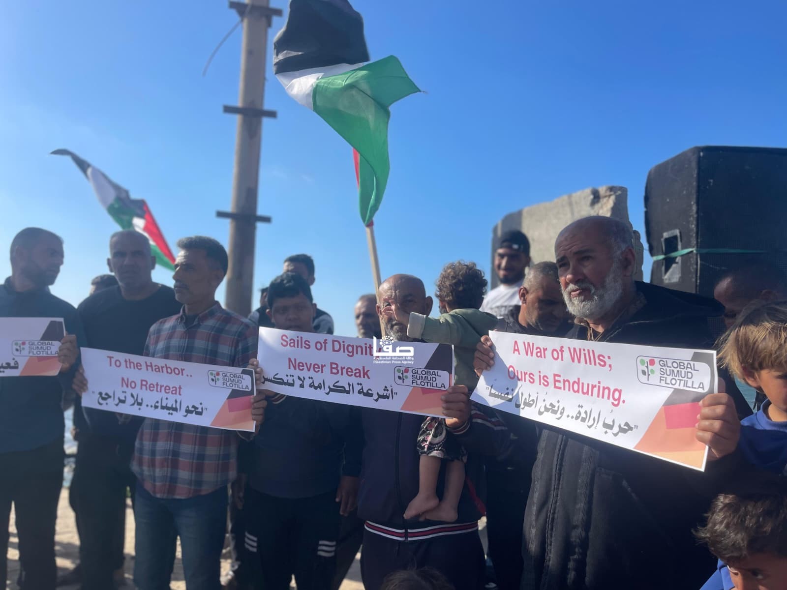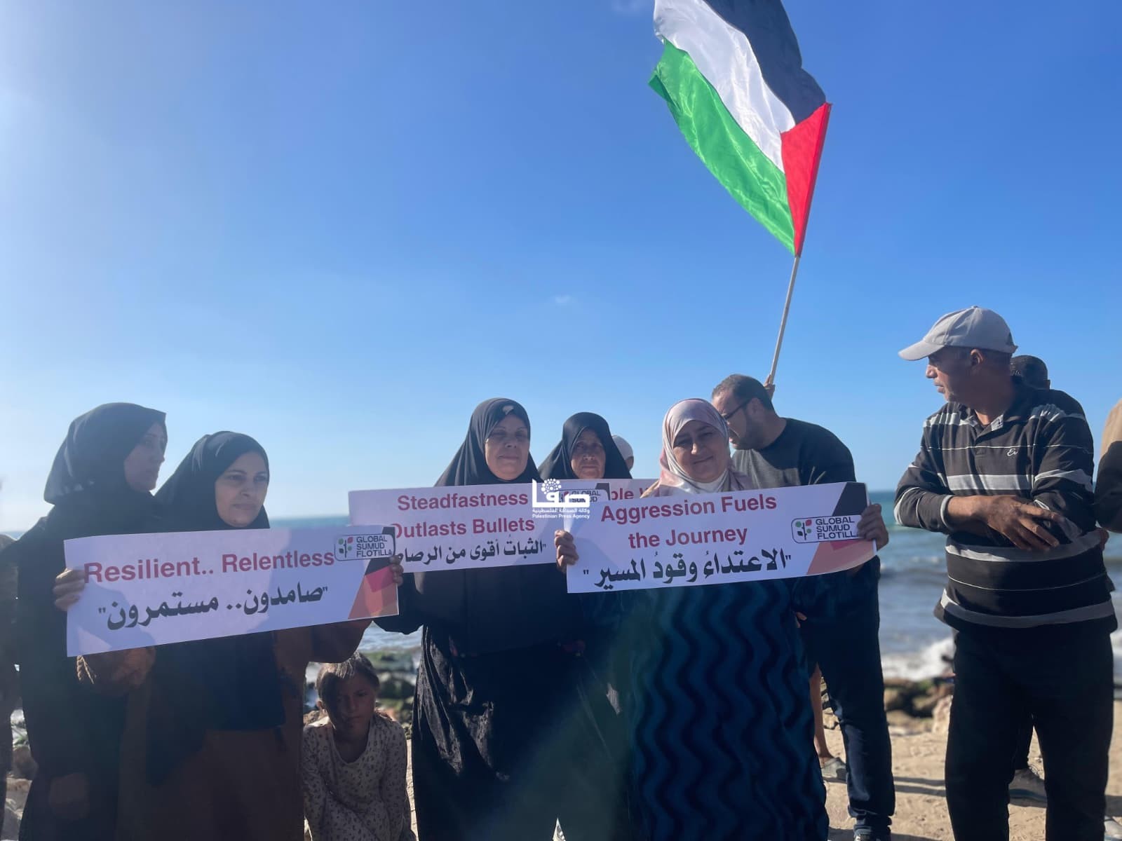 ورفع المحتجون في الوقفة التي نظمت في ميناء غزة، لافتات منددة بجريمة الاحتلال الإسرائيلي كتب عليها: "أشرعة الكرامة لا تنكسر"، "الاعتداء وقود المسير" "صامدون.. مستمرون"، "نحو الميناء بلا تراجع".
