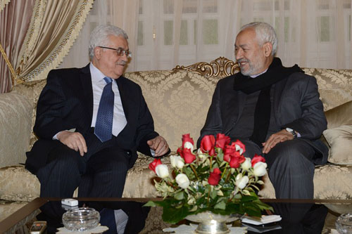 استقبل الرئيس محمود عباس، الليلة، في مقر إقامته بتونس، زعيم حزب حركة النهضة التونسي الشيخ راشد الغنوشي، يرافقه رئيس المكتب السياسي للحركة عامر العريض. ووضع عباس الشيخ الغنوشي في صورة آخر تطورات الأوضاع التي تشهدها الأرض الفلسطينية، والجهود التي يبذلها من أجل إتمام ملف المصالحة الفلسطينية، وما تتعرض له مدينة القدس المحتلة من خطر التهويد، إضافة إلى الأخطار التي تتهدد المسجد الأقصى المبارك. وتطرق عباس إلى الأوضاع الصعبة التي يعيشها أبناء شعبنا الفلسطيني في ظل الحصار الخانق المفروض عليه، وكذلك التطورات المستجدة إثر حصول فلسطين على عضوية مراقب في الجمعية العامة للأمم المتحدة .