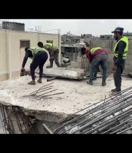 أعمال إزالة مئذنة مسجد سقطت على منزل في مخيم النصيرات وسط قطاع غزة جراء قصف الإسرائيلي