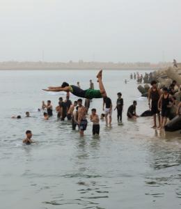 هربًا من حر الخيام.. أهالي #غزة يلجأون إلى البحر رغم تلوث مياهه بالصرف الصحي